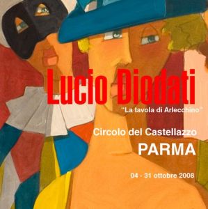 Arlecchino è comparso la prima volta alla metà degli anni Ottanta tra una avvincente irripetibile folla di donne, muse eterne di una suggestiva iconografia, questa enigmatica figura non ha mai più abbandonato la scena della ricerca di Lucio Diodati. Nel suo racconto pittorico, il personaggio più tipico e universalmente conosciuto del teatro goldoniano, solo nell’ apparenza esterna simile all’ originale della tradizione, perduta ogni cadenza marionettistica, é apparso subito come elemento equilibratore rispetto alle altre limitate apparizioni maschili: quelle del carabiniere, del bagnino e del domatore.